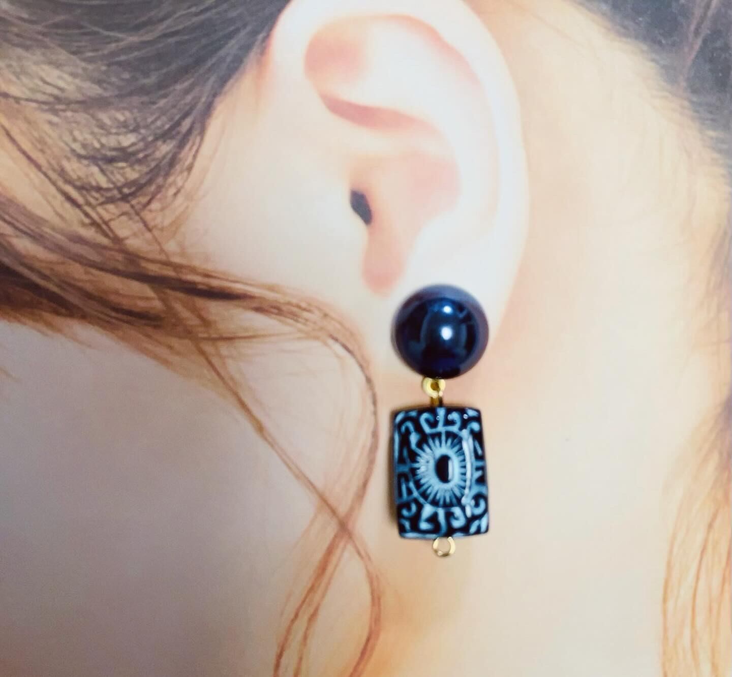 ネイビーの半円のカボションに、アートっぽい模様入りのビーズを合わせました。