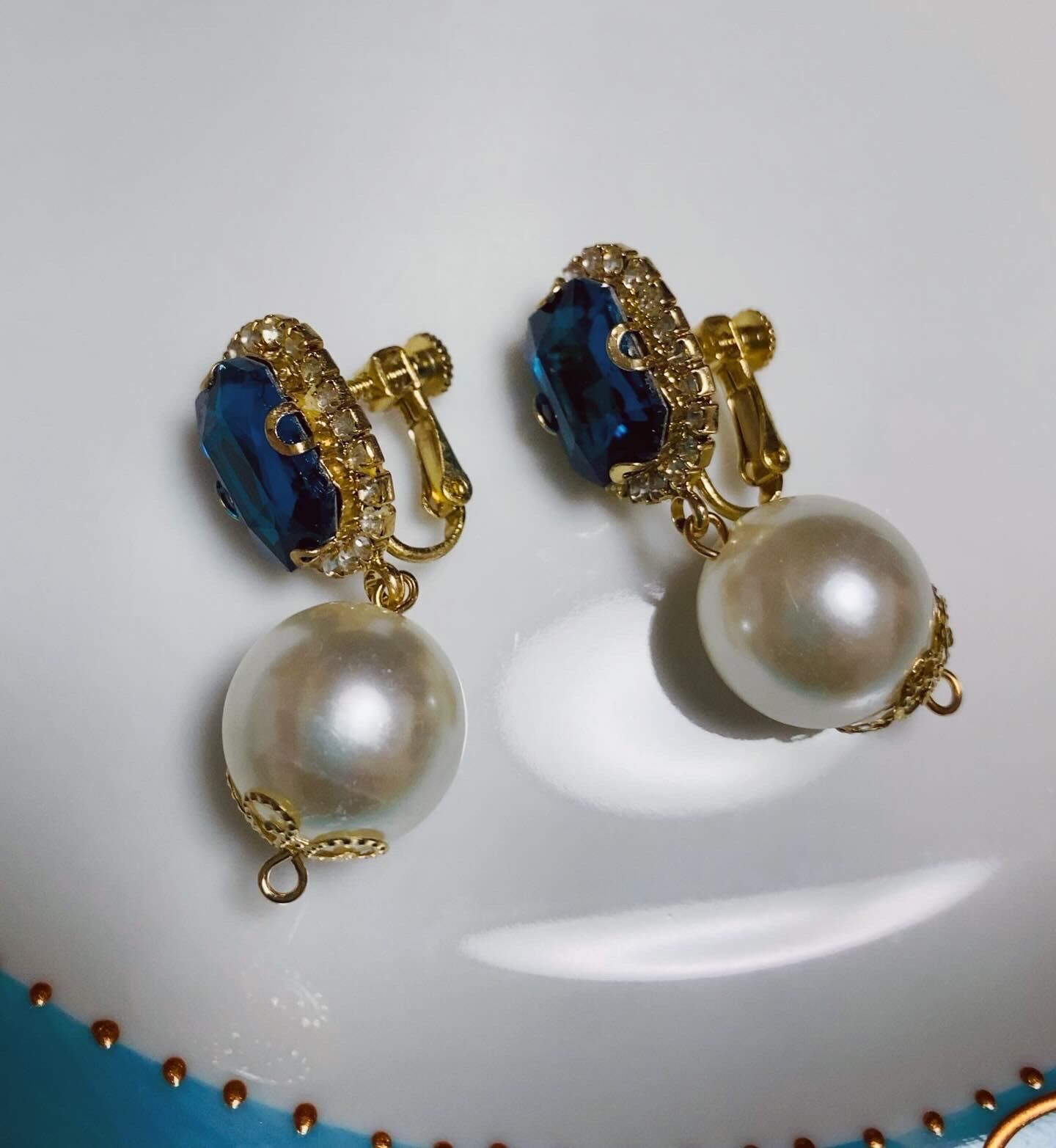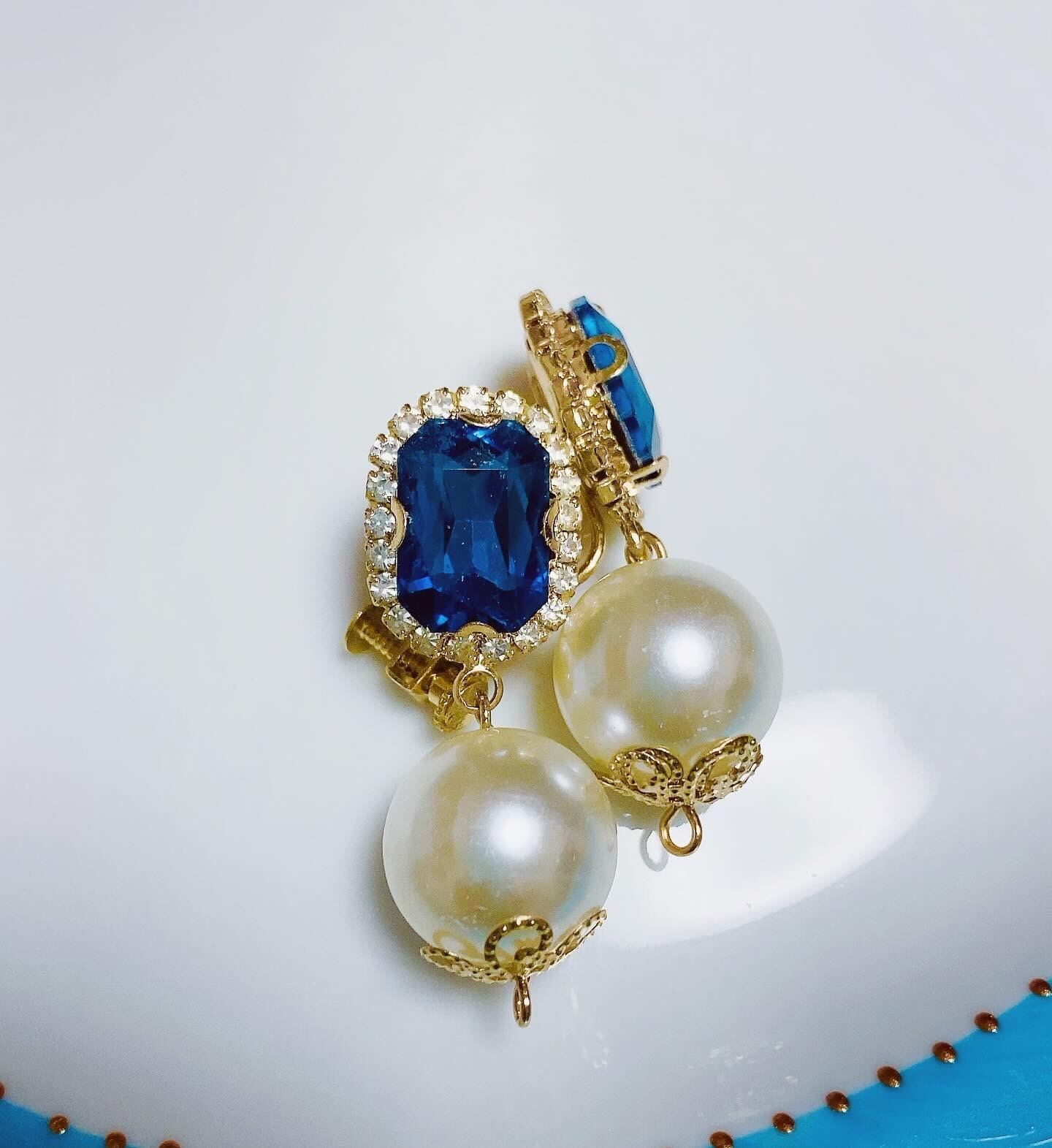 周りをビジューで飾った、深いグリーンガラスストーンに16㎜のイミテーションパールを合わせました。
