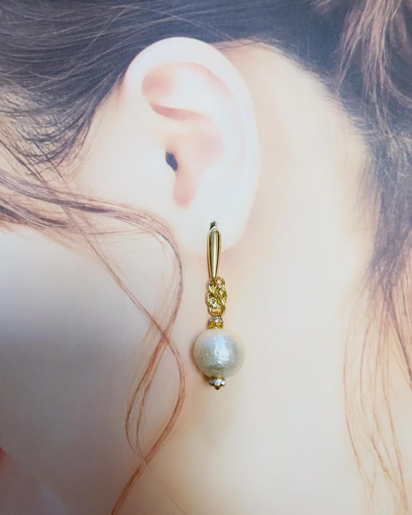 14mmのエアパールにラインストーンのロンデルなどつけたピアスです。