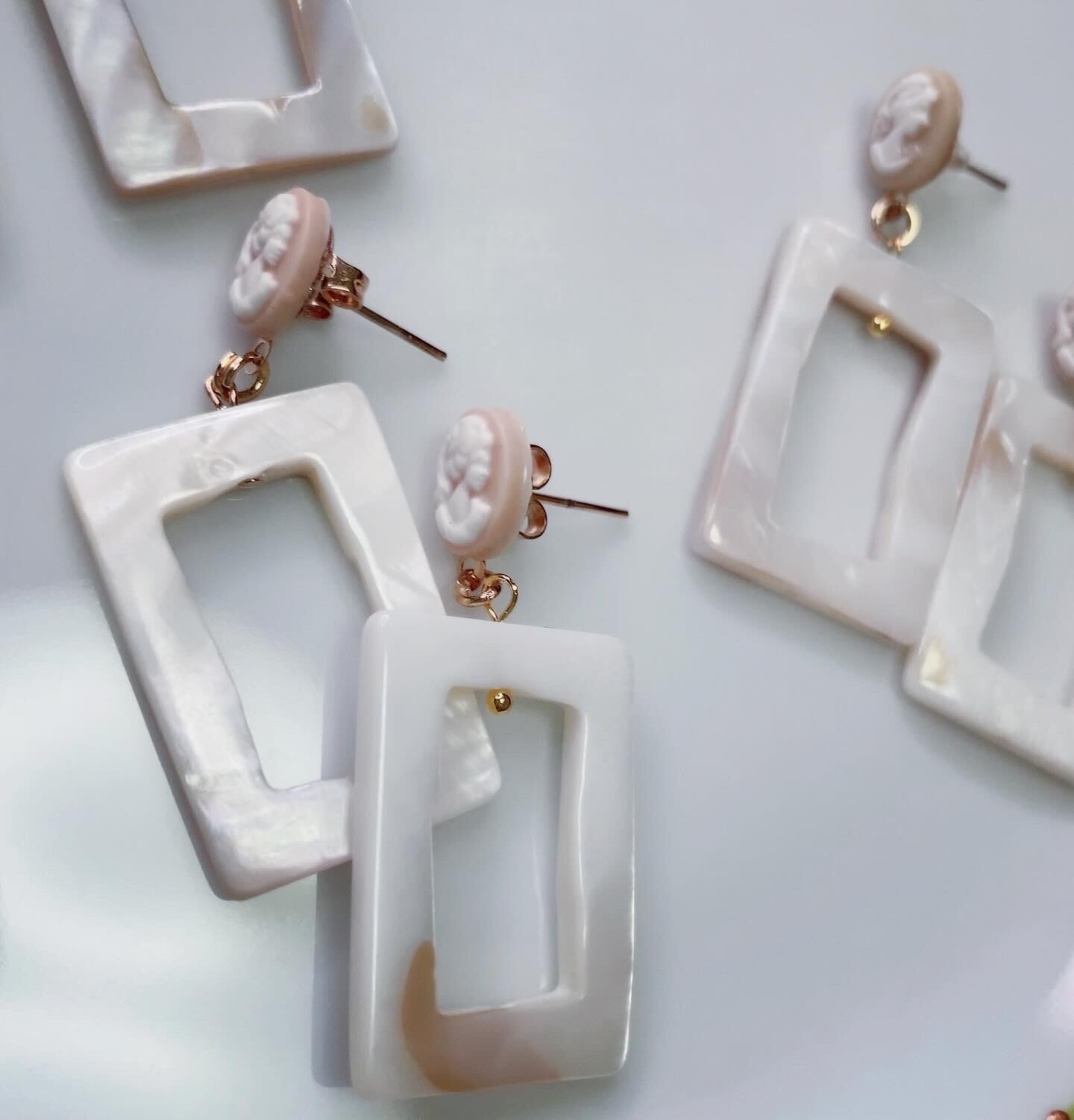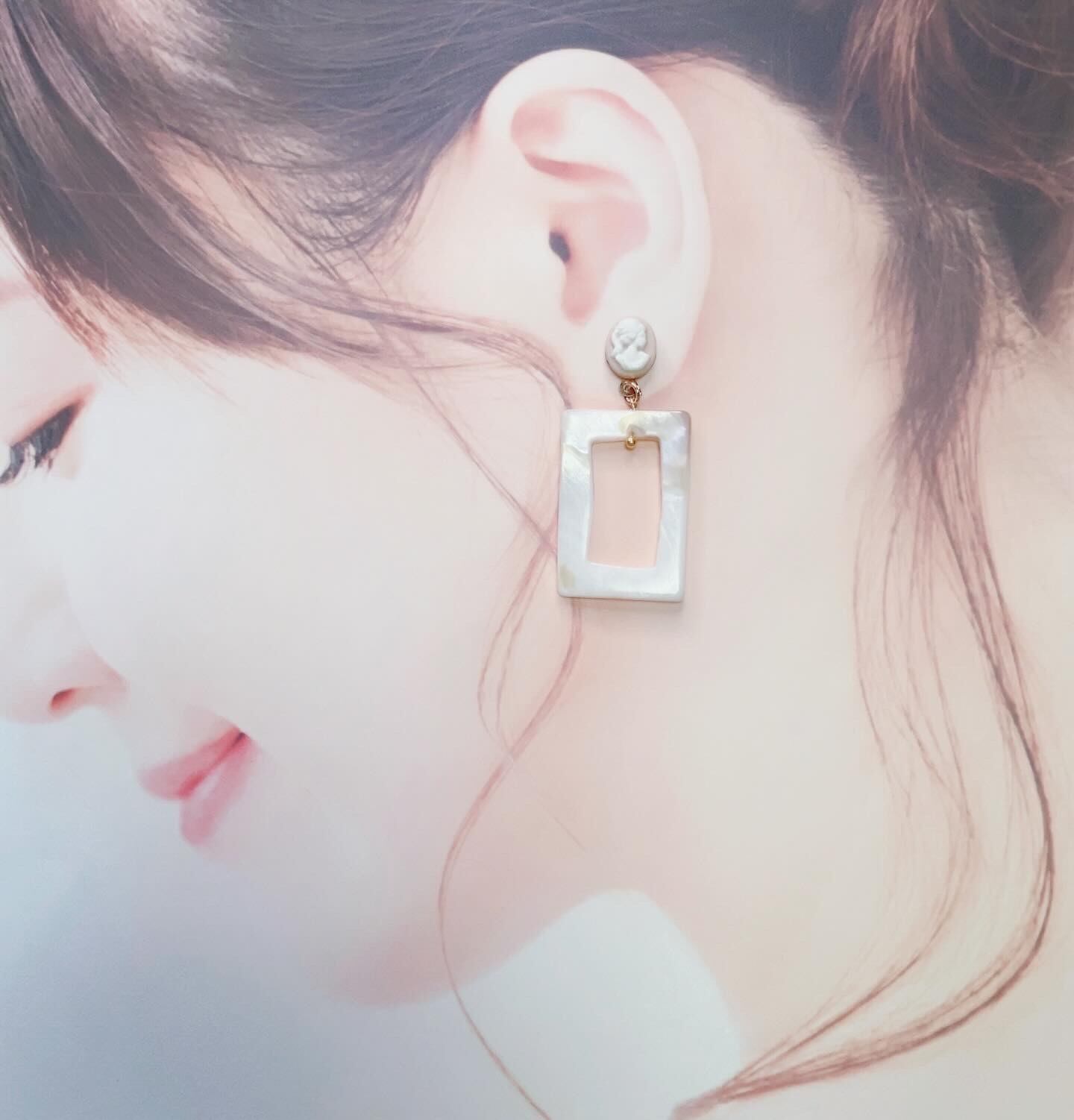 長方形のェルビーズと、カメオ風カボションを合わせた、ピアスとイヤリングです。