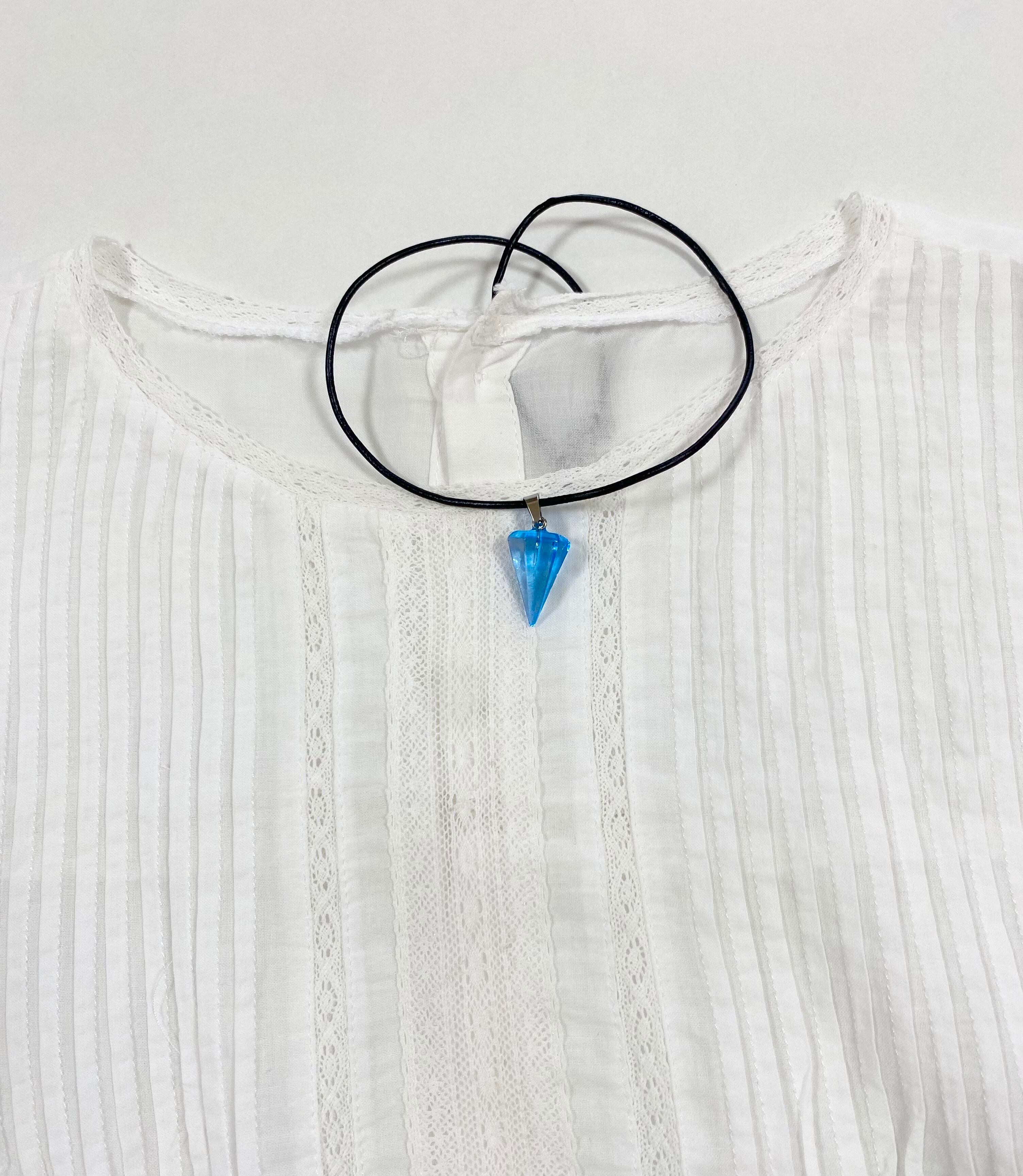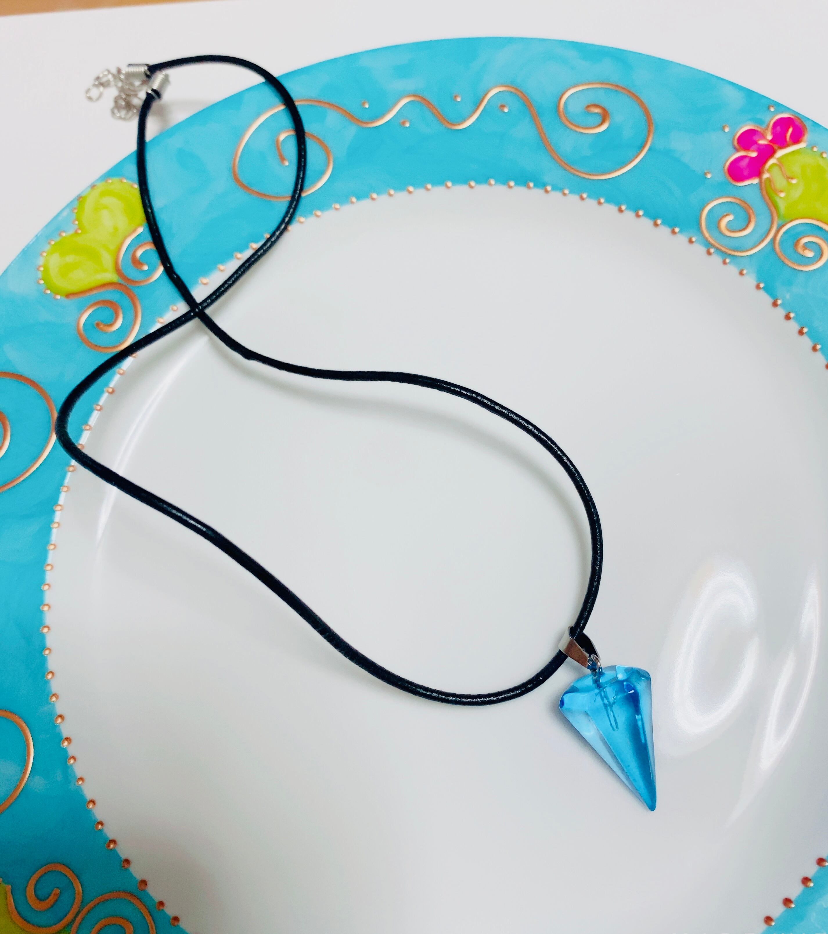 透明感のあるブルーのコーンを合皮のペンダントトップにしました。