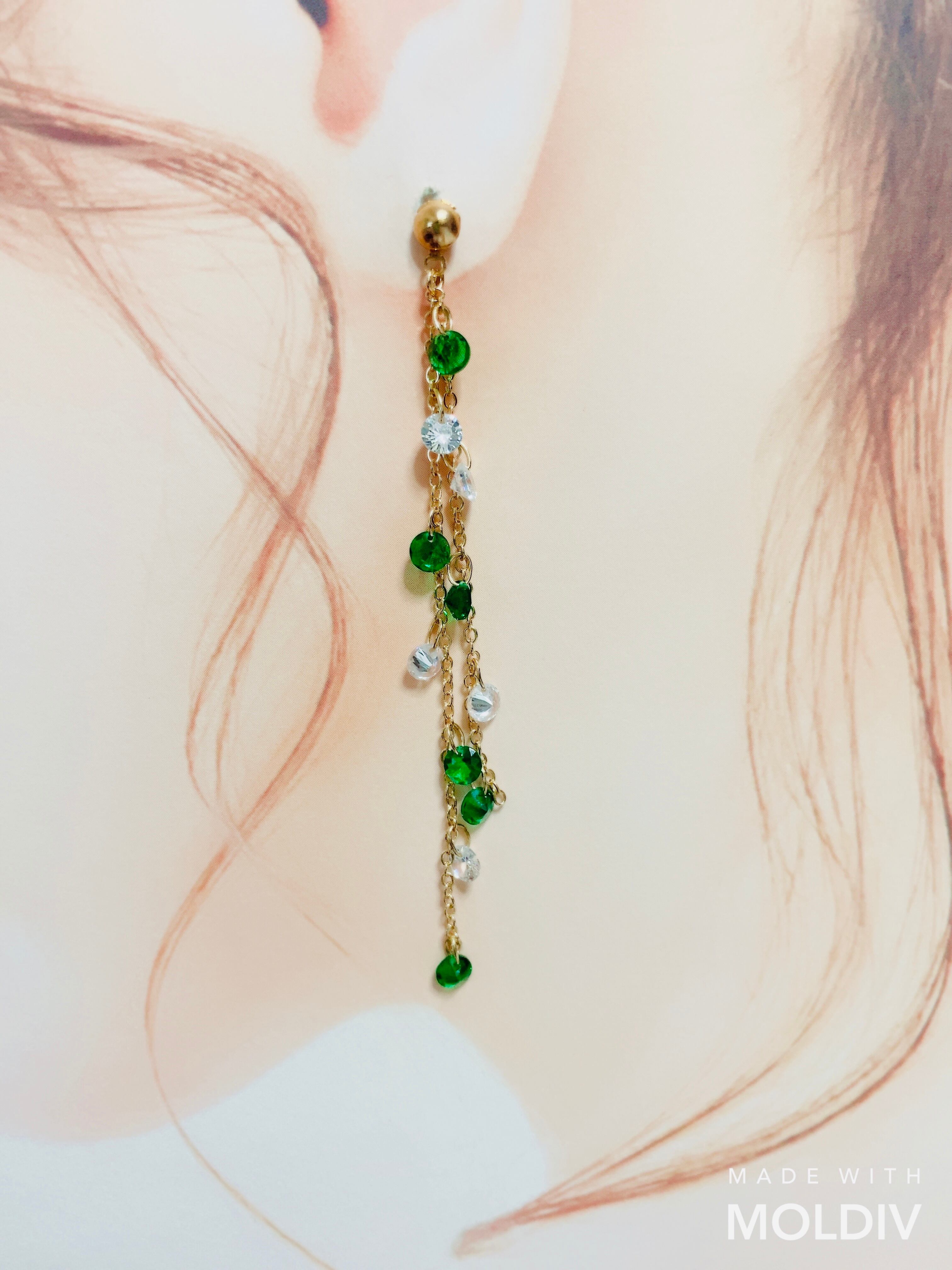 グリーンとクリアカラーのストーンチェーンのピアスです。